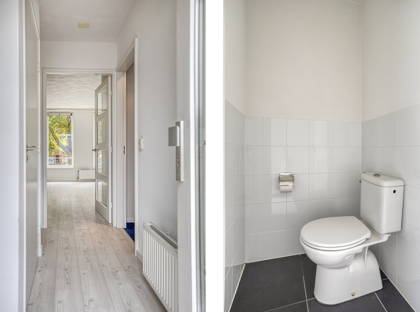 Bij binnenkomst stap je in de hal met meterkast, moderne toiletruimte en aansluiting voor de wasmachine.