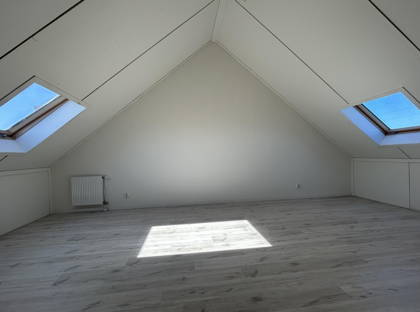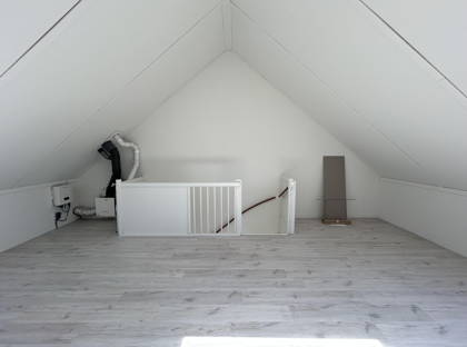 Op de zolderverdieping bevinden zich de aansluitingen voor de wasmachine en wasdroger en bergruimte in de schuine kap.