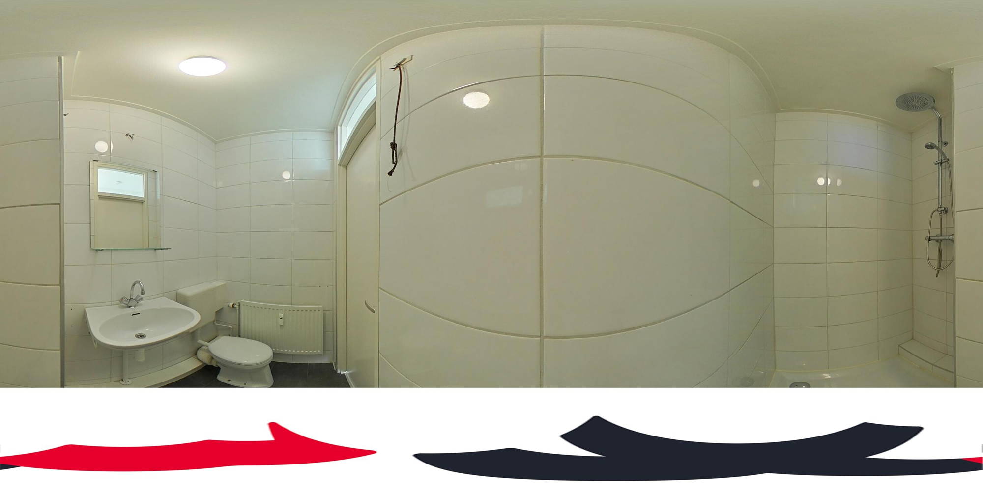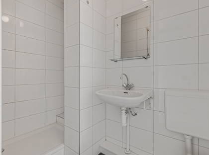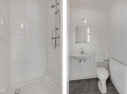 + Licht betegelde badkamer met inloopdouche (voorzien van regendouche) toilet en wastafel.