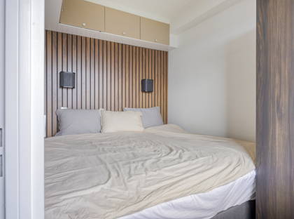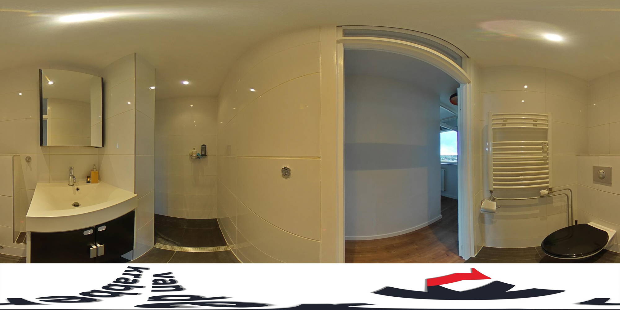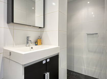 De ruime slaapkamer biedt voldoende plaats voor een tweepersoonsbed en heeft extra bergruimte boven de kasten. De badkamer is tot aan het plafond betegeld en voorzien van een inloopdouche, wastafelmeubel, hangtoilet en inbouwspotjes.