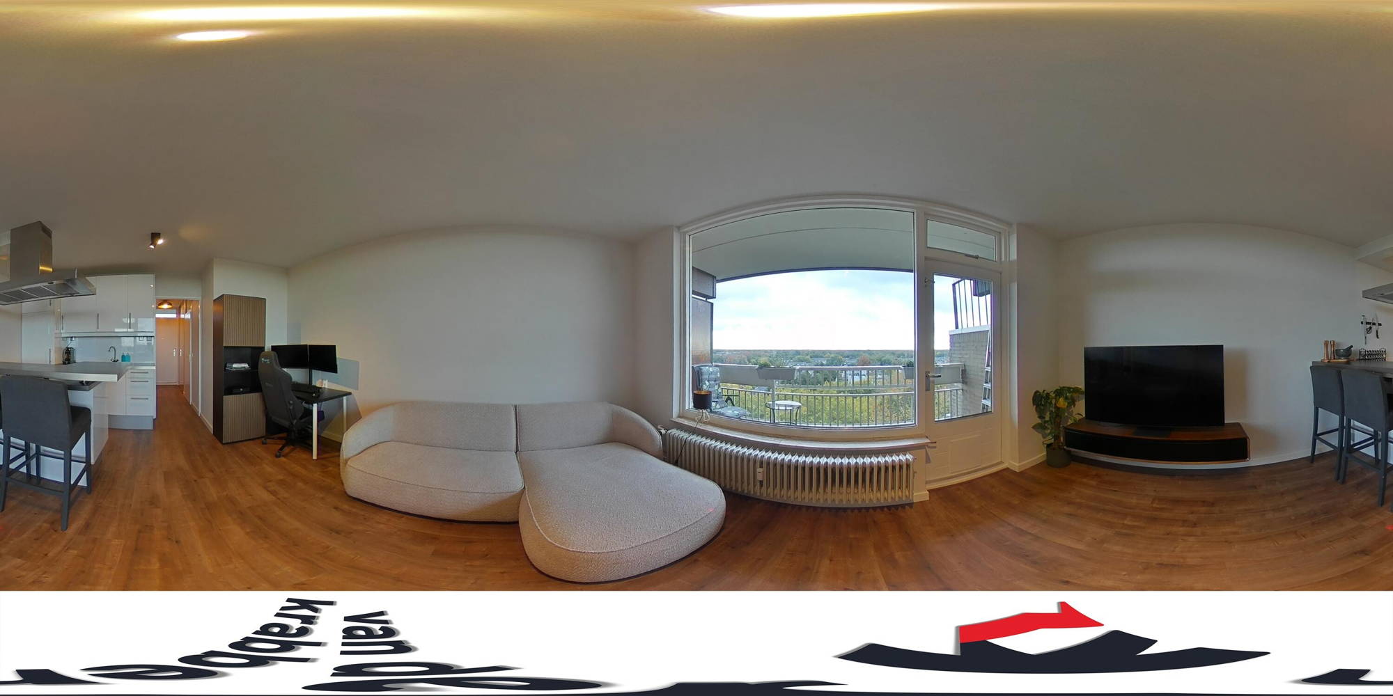 De lichte woonkamer heeft grote ramen met een prachtig uitzicht en een open keuken met kookeiland. De keuken is uitgerust met inbouwapparatuur: een keramische kookplaat, combimagnetron, koelkast, diepvries en vaatwasser. De L-vormige bar rondom het eiland maakt dit een gezellige plek om te borrelen of te tafelen met vrienden.