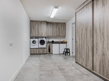 + De multifunctionele garage is strak afgewerkt en ingericht met een vaste kastenwand, de witgoedaansluitingen en een keukenblok. Daarnaast vind je hier een luik met vlizotrap naar de eerste bergzolder.