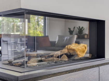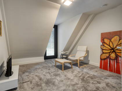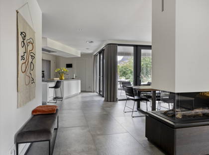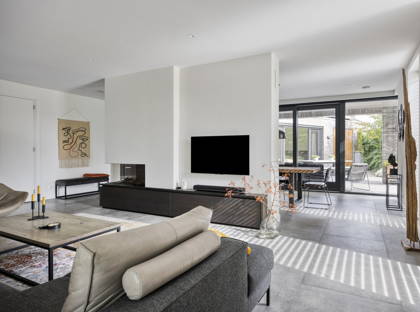 + De woonkamer is royaal opgezet en heeft een stijlvolle tegelvloer met vloerverwarming en een sfeervolle gashaard. De grote raampartijen met triple glas zorgen voor veel lichtinval en een prachtig uitzicht op de tuin.