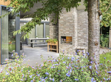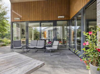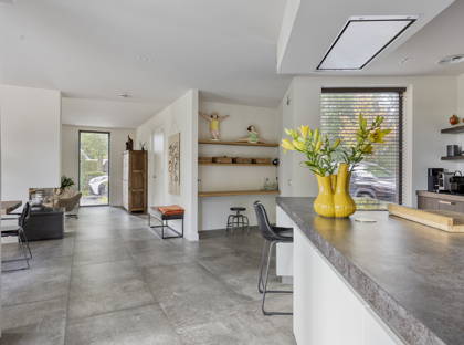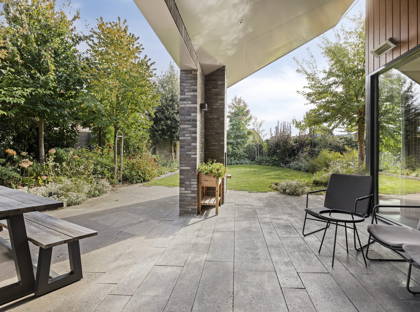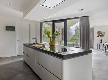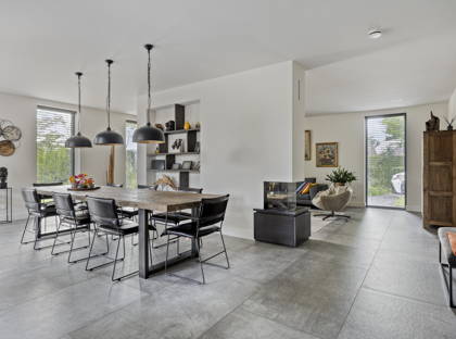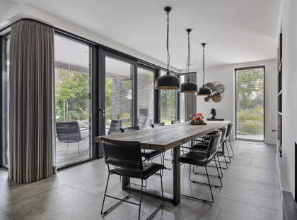 + Ook de eethoek staat in een vloeiende verbinding met de achtertuin door middel van de brede schuifpui.