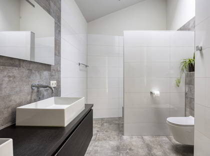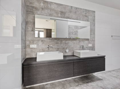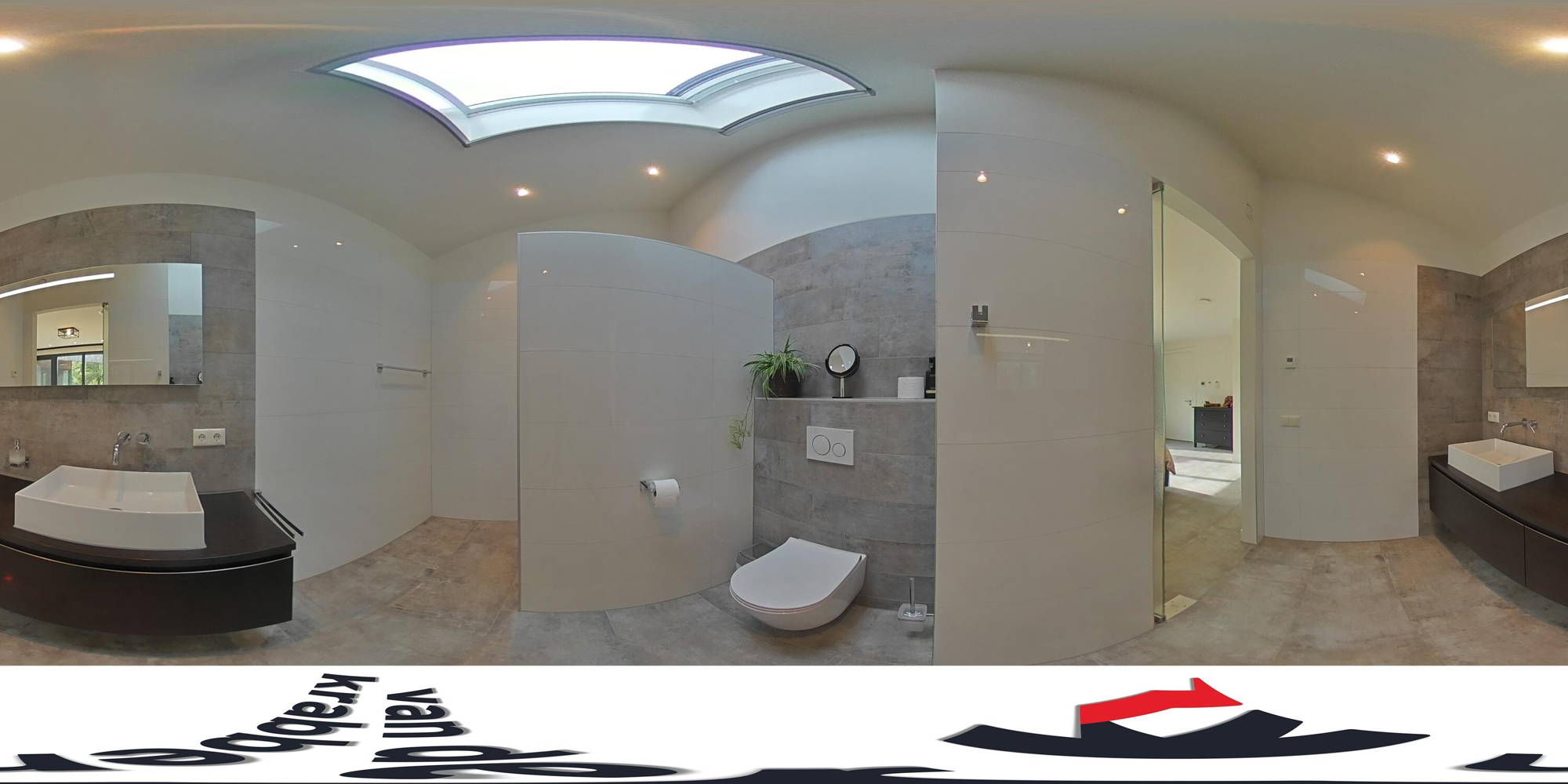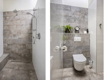 + De eerste badkamer op de begane grond is voorzien van een ruime inloopdouche, badkamermeubel met dubbele wastafel en wandtoilet.