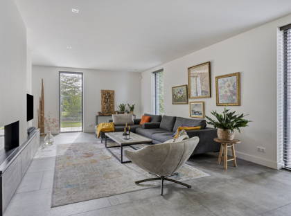 Binnen stap je in een lichte, open leefruimte waar woonplezier centraal staat. De royale woonkamer is voorzien van een sfeervolle gashaard, grote raampartijen tot de grond en een fraaie tegelvloer met vloerverwarming. De open keuken met kookeiland is een echte eyecatcher en van alle luxe gemakken voorzien. Daarnaast beschikt de woning over een inpandige garage met de witgoedaansluitingen en een ruime slaapkamer met walk-in closet en luxe badkamer op de begane grond. Dankzij de complete woonlaag is de woning uitstekend geschikt voor levensloopbestendig wonen.