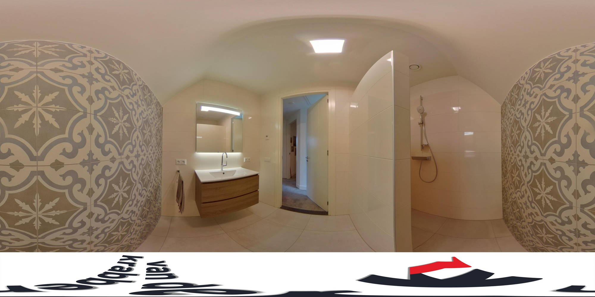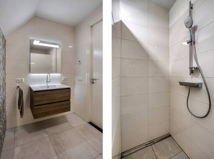 + Ook de tweede badkamer is modern uitgevoerd met een inloopdouche en een badkamermeubel met wastafel.