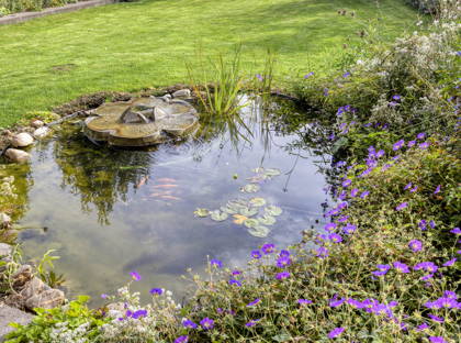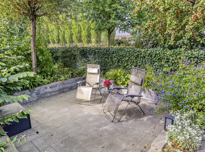 + De tuin rondom de woning is fraai aangelegd met veel groen, een vijver en een sproei-installatie. De ligging zorgt voor veel zon en privacy, met meerdere terrassen en een royale overkapping met heaters en haard. Ook beschikt de tuin over een directe achterom en een berging.