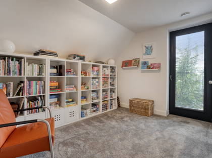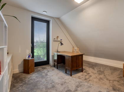 + Via een open trap in de hal bereik je de eerste verdieping. Deze verdieping bestaat uit de overloop, drie volwaardige slaapkamers, de badkamer, een separate toiletruimte en de technische ruimte met de HR-combiketel (2018) en de hybride warmtepomp.