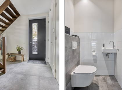 + De ruime hal met de meterkast (22 groepen en 5 aardlekschakelaar) en moderne toiletruimte geeft toegang tot de trapopgang en de woonkamer.