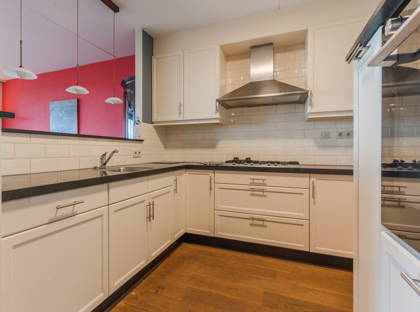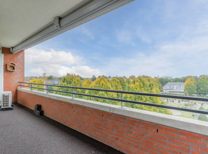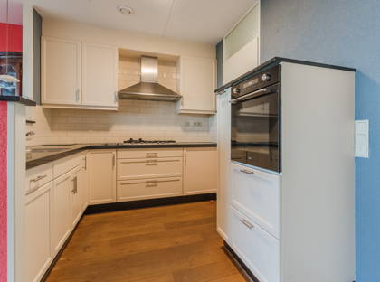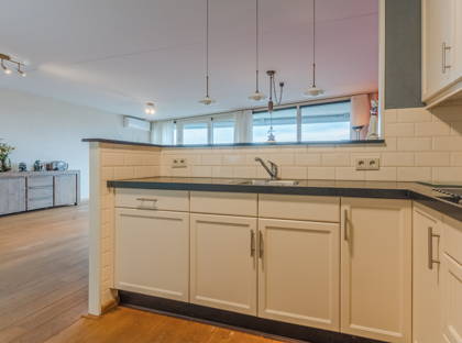 De woonkamer met eiken vloer vormt het hart van het appartement. Dankzij de brede glaspartijen valt er veel daglicht binnen en geniet je van een prettige, open sfeer. In 2024 is hier bovendien een airco geplaatst – ideaal voor een aangenaam binnenklimaat in elk seizoen. De open keuken met oven, gaskookplaat, afzuigkap en vaatwasser sluit hier mooi op aan.