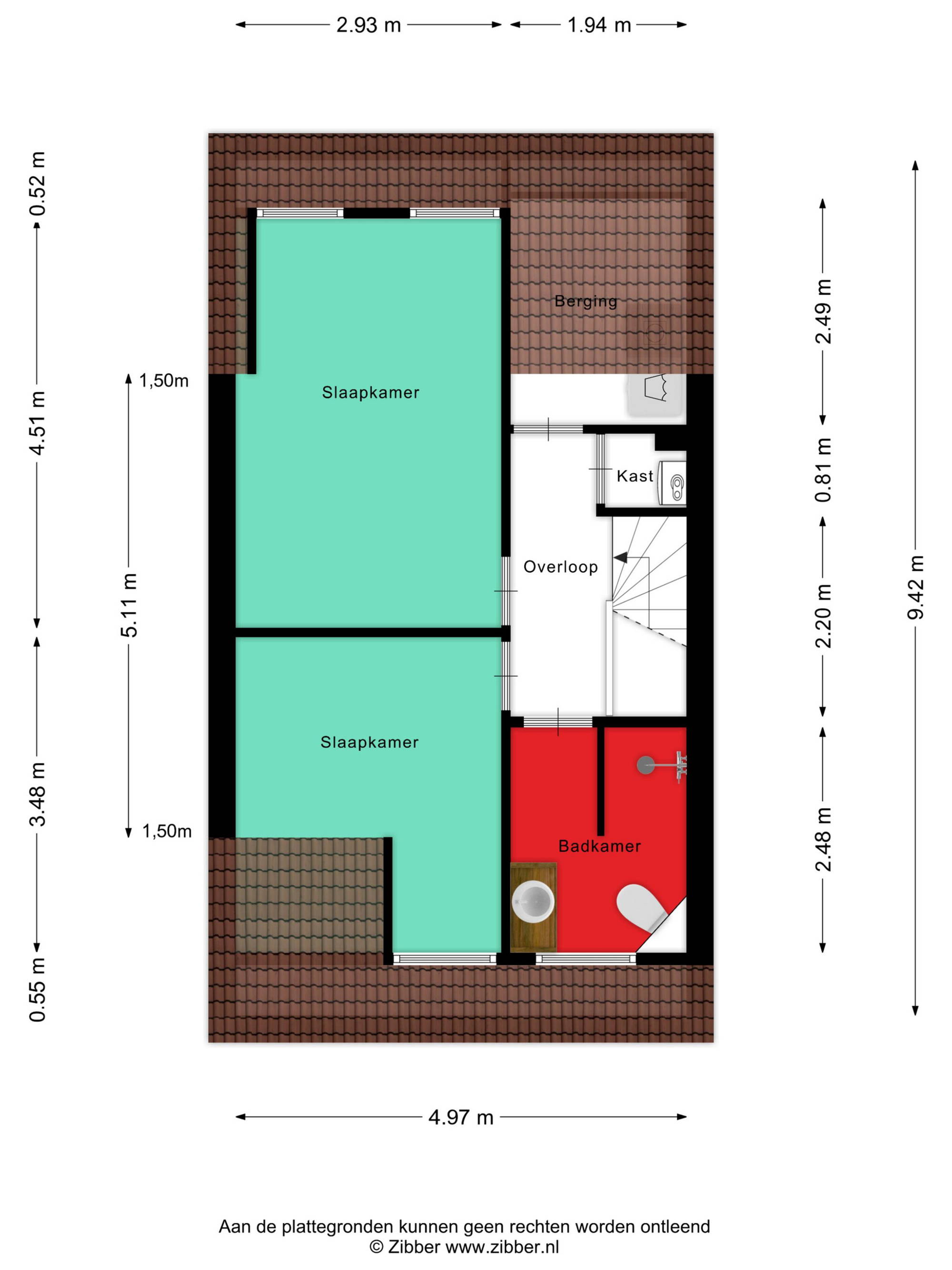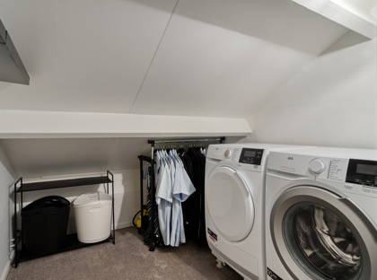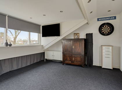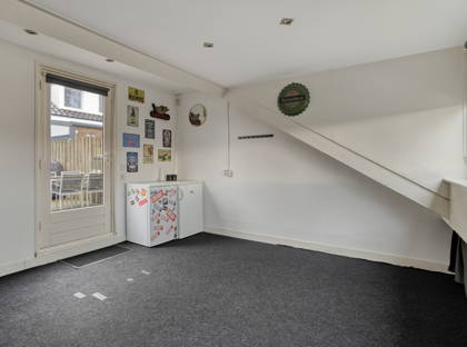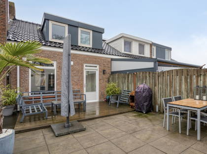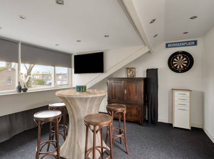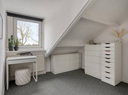 Via de gezamenlijke trap kom je uit bij één van de absolute pluspunten: het riante dakterras op het zuiden. Hier geniet je de hele dag van de zon, of je nu rustig wakker wilt worden met een kop koffie of ’s avonds lekker wilt borrelen. Extra handig: op het terras staat een bijgebouw, ideaal als hobbyruimte, werkplek of extra berging. Aan de andere kant kom je binnen in de woning.