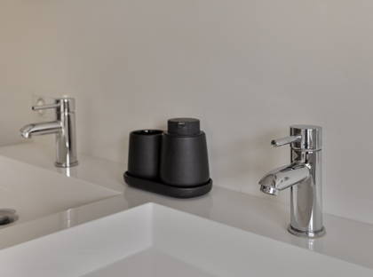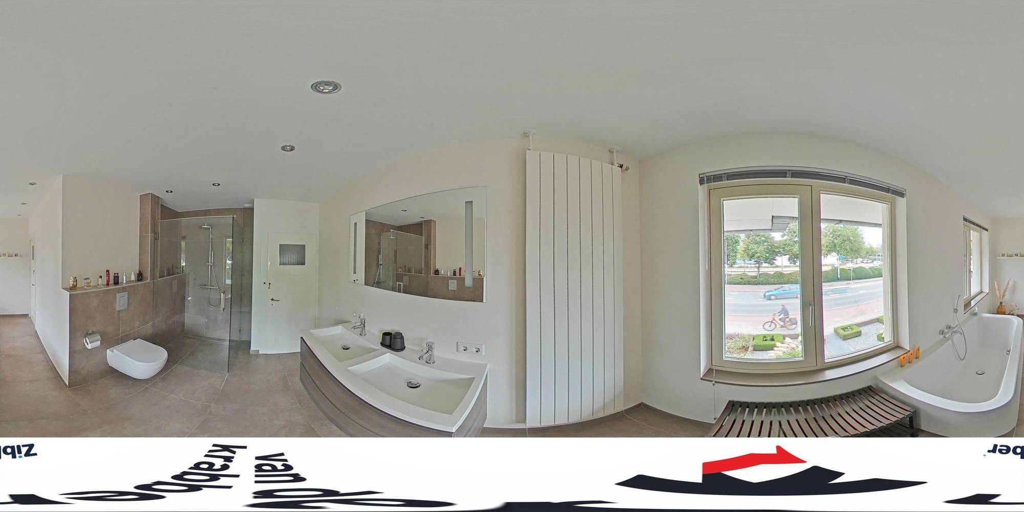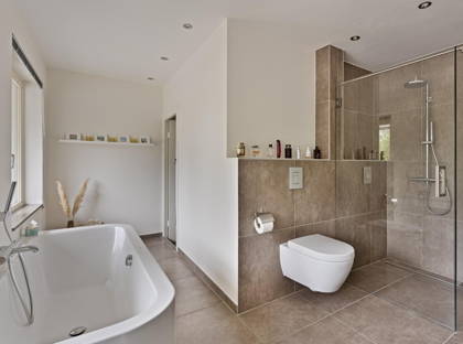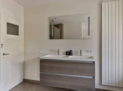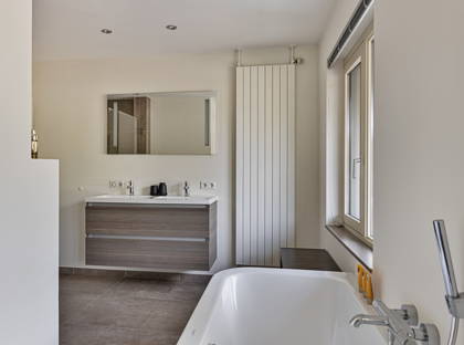 + De luxe badkamer (2015) beschikt over een badkamermeubel met dubbele wastafel, wandtoilet, inloopdouche, ligbad en designradiator.