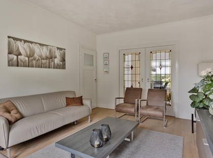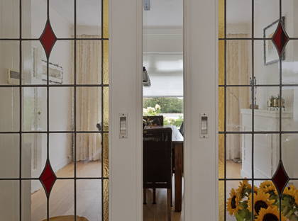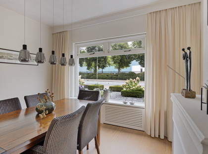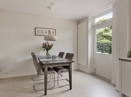 + De lichte eetkamer wordt gescheiden van de woonkamer door middel van sfeervolle glas-in-lood schuifdeuren met aan beide kanten een inbouwkast. In zowel de eet- als de woonkamer ligt een prachtige houten vloer.