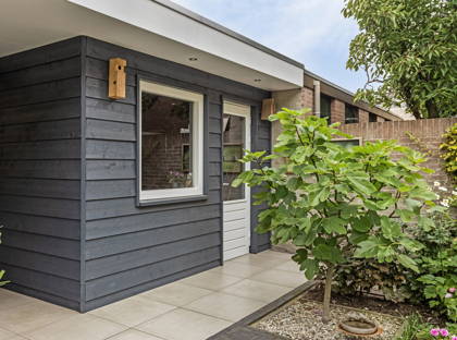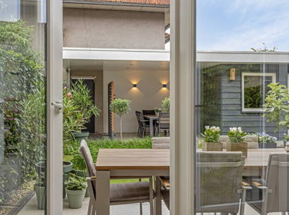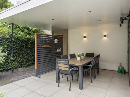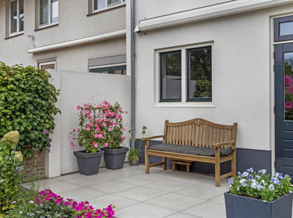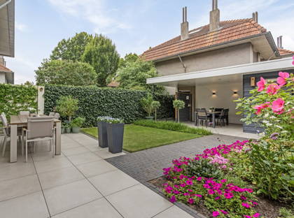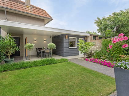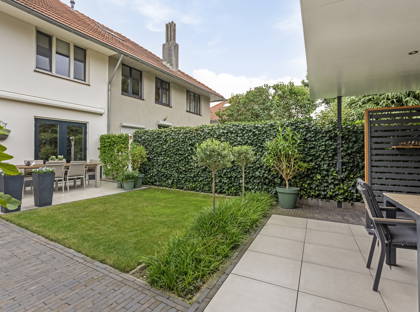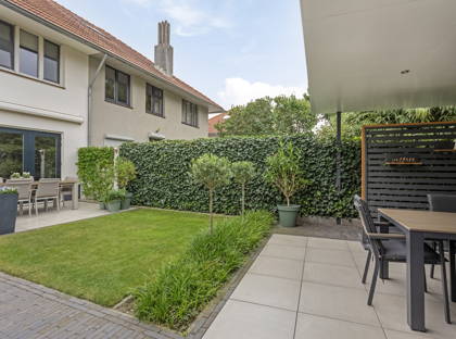 + De tuin is onderverdeeld in een breed terras met zonneluifel, een gazon, kleurrijke plantenborders en een overkapping met stroom, zithoek en berging. Daarnaast beschikt de achtertuin over een directe achterom en een grondwaterpuls.