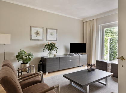 + De woonkamer is voorzien van een gashaard en openslaande deuren naar de tuin.