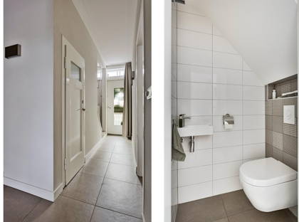 + De twee overkapte voordeuren brengen je in de ruime hal met meterkast, moderne toiletruimte (2020) met wandtoilet en fonteintje, trap naar boven en trap naar de kelder.
