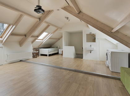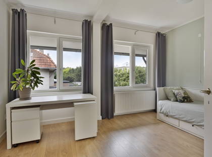 + De tweede verdieping met dakkapel is met een vaste trap bereikbaar en multifunctioneel in te richten. Op dit moment vind je hier de vijfde slaapkamer met wastafel, een berging met cv-ketel (2025), de witgoedaansluitingen en knieschotten voor extra bergruimte.