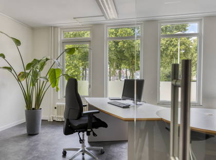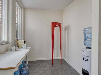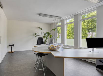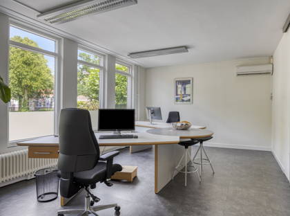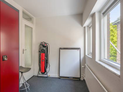 + Het kantoor aan de voorzijde is uitgevoerd met vier ramen, een plavuizenvloer en airco. De werkruimte achter heeft drie ramen en een deur naar een hal. In deze hal zijn twee vaste kasten, de eigen meterkast met afzonderlijke HR-combiketel en een buitendeur naar de achtertuin.