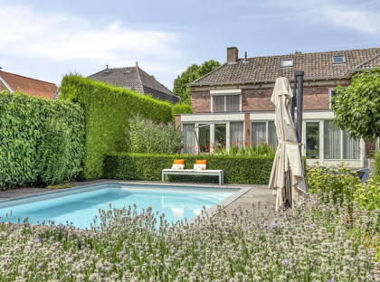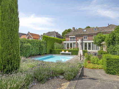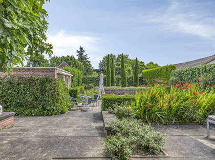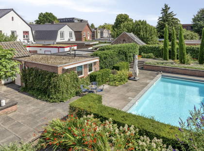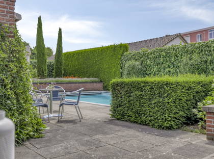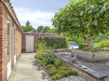 + Riante achtertuin biedt door de ligging, inrichting en groene hagen rondom veel privacy, rust en zonuren. De tuin is fraai groen vormgegeven met diverse terrassen, niveauverschillen, perken, borders en een groot zwembad. Stijlvolle bomen, heesters en een verscheidenheid aan beplanting zorgen voor een schitterende, serene sfeer. Een breed - overkapt - pad en houten poort naast de woning bieden een achterom naar de voorzijde.