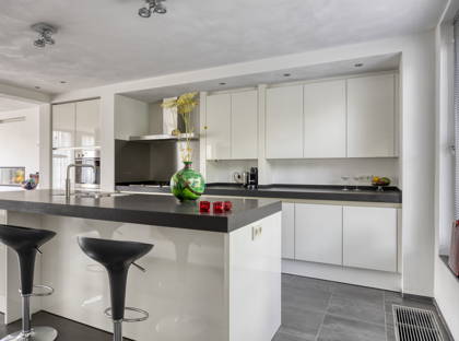 + Openslaande glazen deuren geven toegang tot de tuingerichte L-vormige woonkamer met open doorgang naar leefkeuken. De glasgevel met dubbele openslaande deuren laat in de beide ruimtes het licht rijkelijk binnen. De lichte tinten van strakke wanden en schuurwerkplafond versterken het heldere karakter. In de woonkamer ligt een stijlvolle gietvloer. Een binnendeur in de woonkamer komt uit in een hal aan de achterzijde bij kantoorgedeelte.