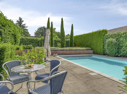 + In grote stenen berging bij het tuinhuis is de zwembadinstallatie geïnstalleerd. Deze bevat een afzonderlijke HR-combiketel voor verwarmen van het water. Boven twee ramen is een zonneluifel gemonteerd.