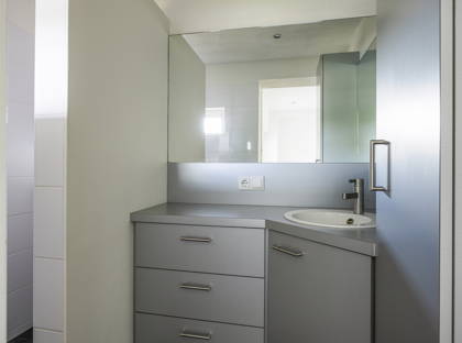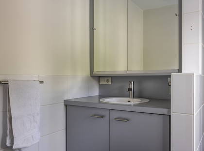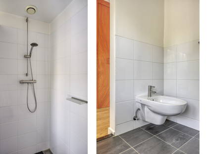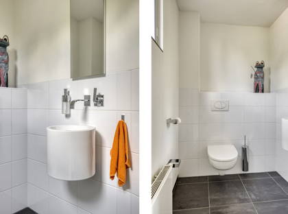 + Moderne toiletruimte op de verdieping heeft een wandtoilet en fonteintje.