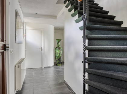 + Pad in zeer royale voortuin leidt naar de voordeur. De voortuin is stijlvol vormgegeven met perken en lage hagen. Binnenkomst in de hal met trapopgang, bergkast en moderne toiletruimte. De toiletruimte bevat een wandtoilet en kolom-fonteintje. In de hal ligt een plavuizenvloer die verder