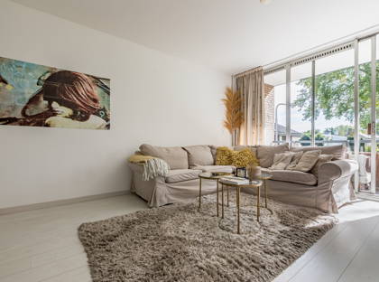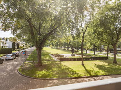 De woonkamer is het hart van dit appartement: licht, ruim en voorzien van een grote schuifpui naar het balkon. Het balkon is dé plek om even te ontspannen, een kop koffie te drinken in de ochtendzon of ’s avonds te genieten van de rust en het groene uitzicht over het parkje.