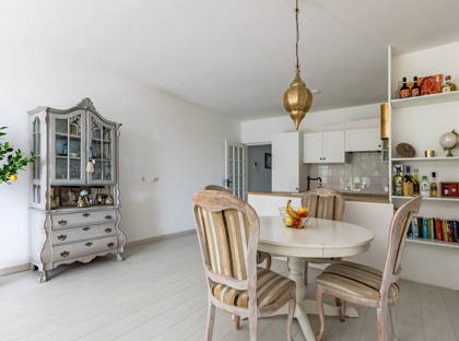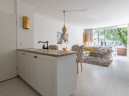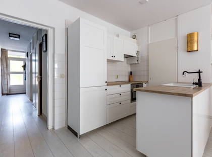 De open keuken (2017) is modern en praktisch ingericht met een koelkast, inductieplaat, afzuigkap, combi-oven, spoelbak en een handige voorraadkast. De laminaatvloer die door het hele appartement ligt, geeft het geheel een verzorgde en warme uitstraling.