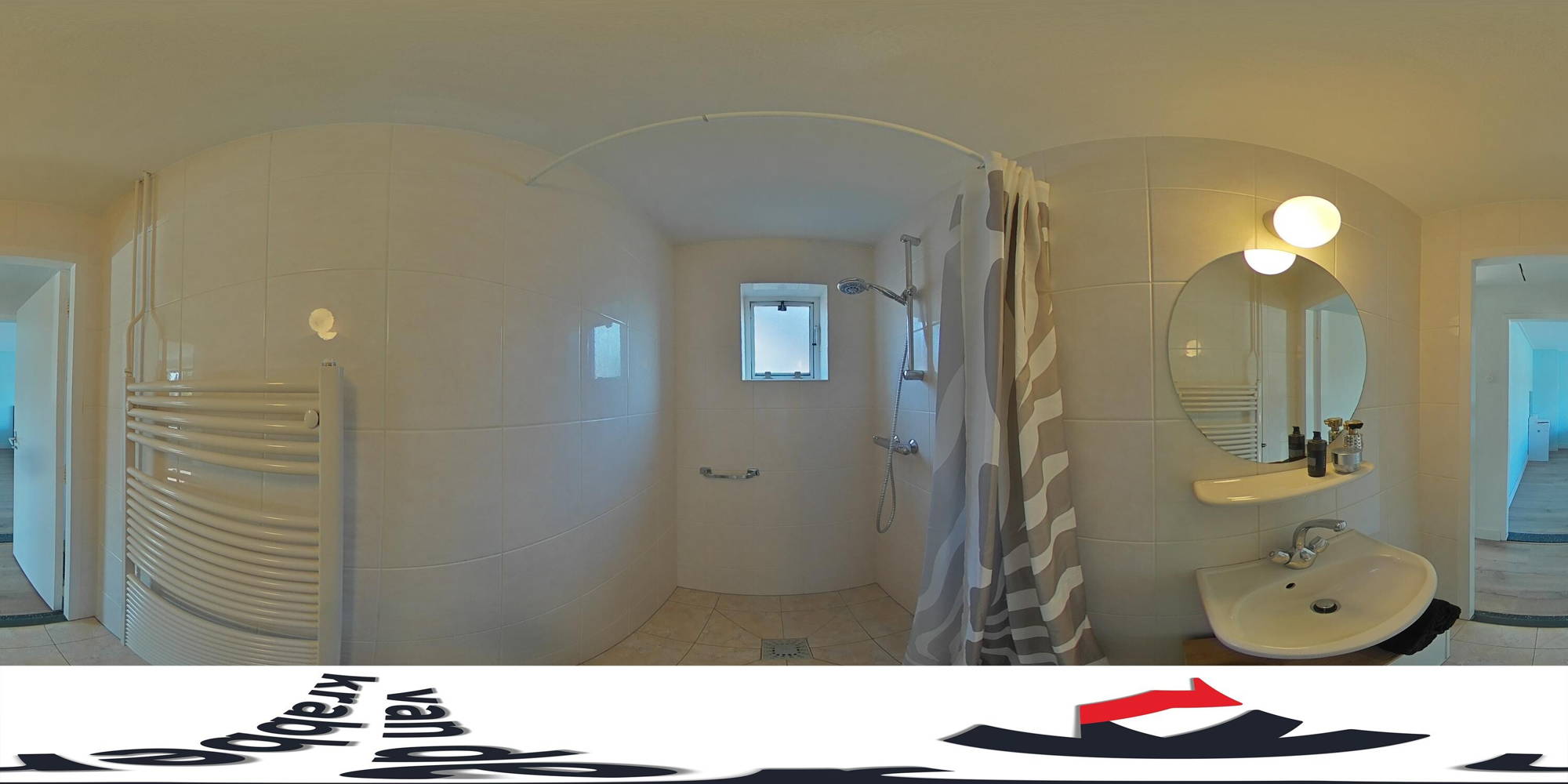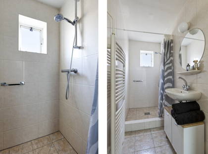 + De volledig betegelde badkamer is uitgerust met een douche, badkamermeubel met wastafel en designradiator.