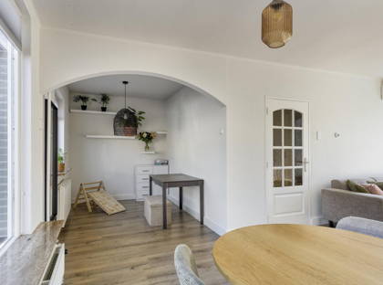 + De royale L-vormige doorzonwoonkamer is strak afgewerkt met een laminaatvloer en hoge plinten en beschikt over grote raampartijen met dubbel glas, wat zorgt voor een aangename lichtinval. De ruimte biedt volop mogelijkheden voor het inrichten van zowel een zithoek, een eethoek als bijvoorbeeld een werkplek of speelhoek. De open haard en airconditioning dragen bij aan extra comfort, terwijl de schuifpui zorgt voor een directe verbinding met de achtertuin.