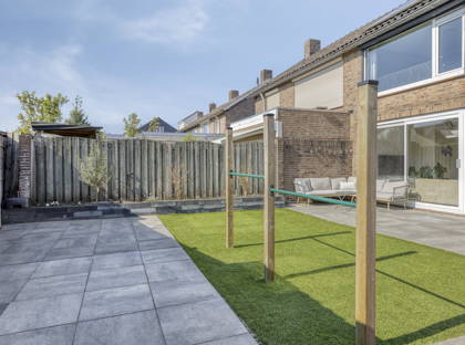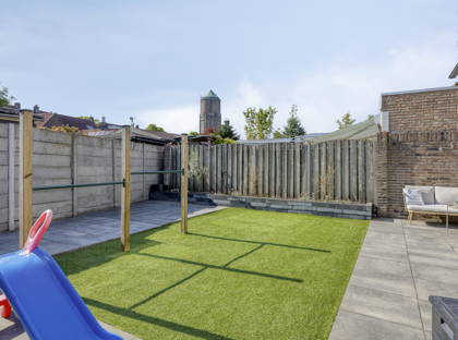 + De achtertuin is gunstig gelegen op het zonnige zuidwesten en onderhoudsvriendelijk aangelegd met een terras, kunstgras en een groene border. Vanuit de tuin heb je bovendien een fraai uitzicht op de Oude Watertoren van Oss.