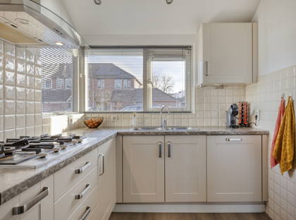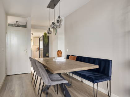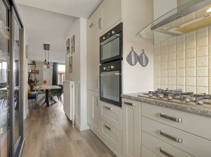 Zodra je binnenkomt op de begane grond, valt direct de goede afwerking op. De woning beschikt over een praktische indeling en is door de jaren heen met aandacht onderhouden. De woonkamer is voorzien van een stijlvolle PVC-vloer en strak afgewerkt met stucwerk, wat zorgt voor een moderne en frisse uitstraling. De open keuken sluit hier perfect op aan en is compleet uitgerust met diverse inbouwapparatuur, zoals een vaatwasser, koelkast, diepvries, oven, magnetron en een 5-pits gaskookplaat. Ideaal voor gezellige familiemomenten of uitgebreid koken met vrienden.