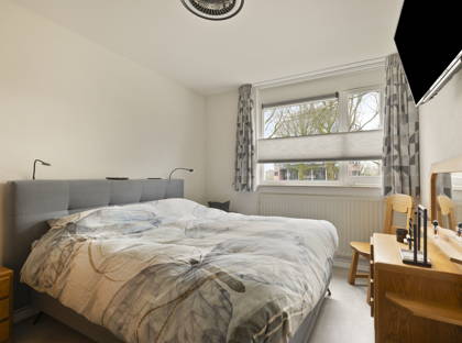 Door naar de volledig vernieuwde badkamer (2024). Een oase van rust, door de grote lichtbeige tegels en de lichte eikenhouten meubels. Je vindt hier een douche, wastafel en radiator. Het aparte toilet is trouwens ook in 2024 volledig vernieuwd – in dezelfde rustige lichte stijl als de badkamer. Verder zijn er in dit appartement 2 slaapkamers aanwezig. Allebei met een grote raampartij en dezelfde lichte pvc-vloer als in de woonkamer.