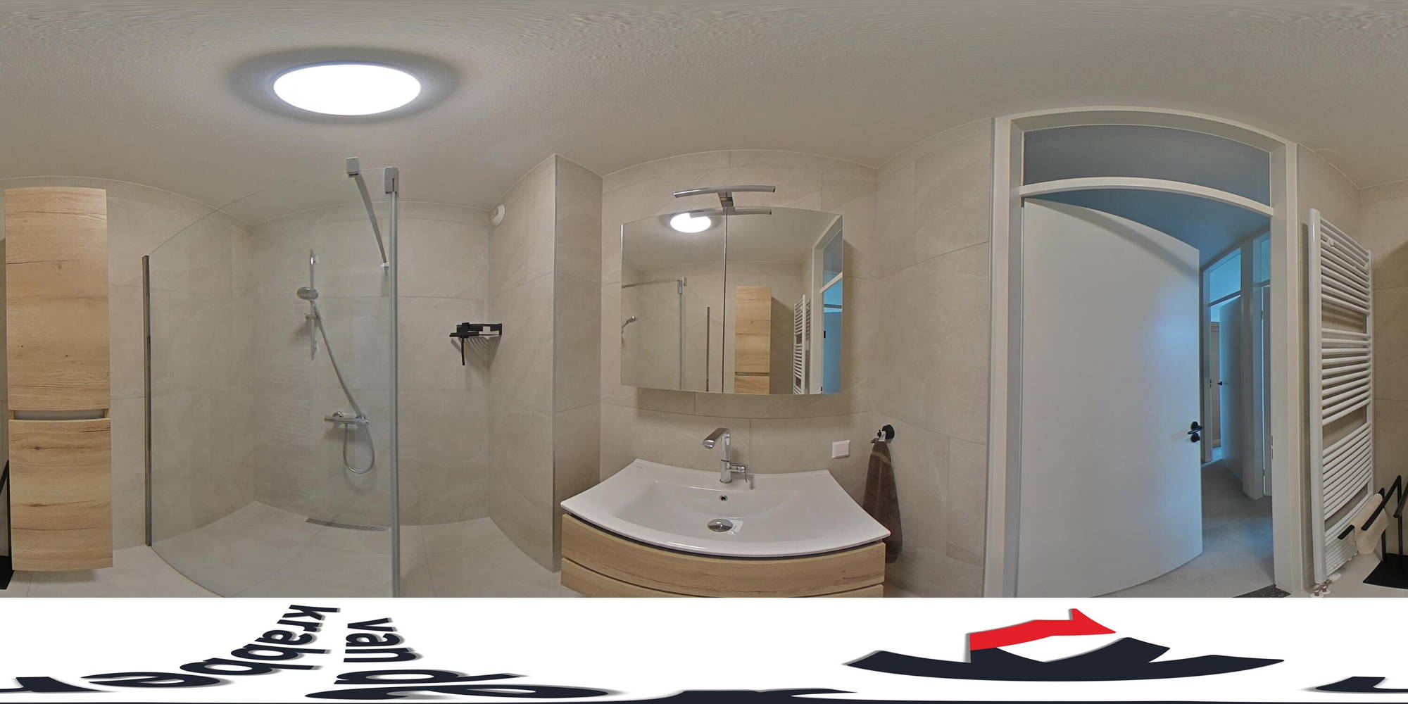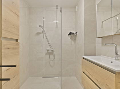 + Volledig vernieuwde badkamer (2024) met lichte beige tegels en licht-houten meubels. Voorzien van douche, wastafel en radiator.
