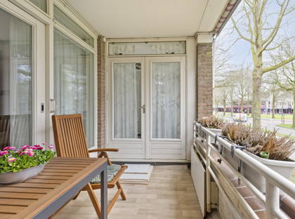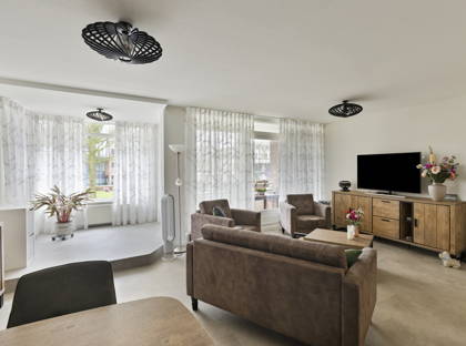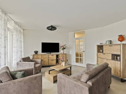 We starten in de woonkamer: door de grote ramen en de fraaie lichte pvc-vloer is dit een fijne lichte ruimte. Erg leuk: het extra opkamertje, dat de ruimte net even interessanter maakt. Via daar loop je zo het balkon op. Waar je heerlijk van de zon kunt genieten, want dit balkon ligt op het Zuiden.