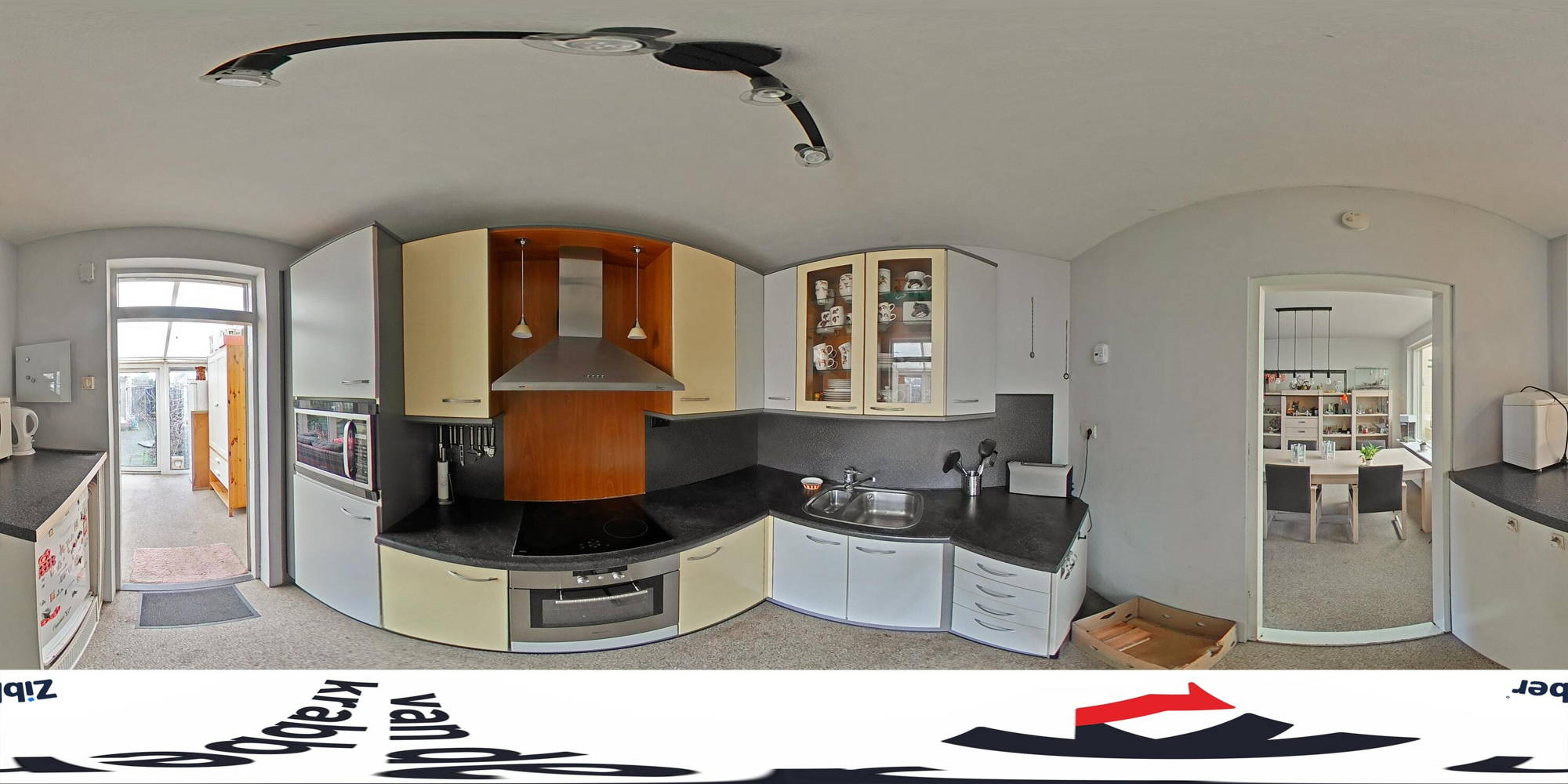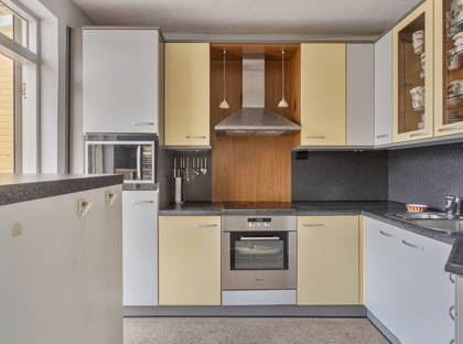 De keuken is apart gesitueerd en beschikt over een keramische kookplaat, een combi-oven, een afzuigkap en een oven. De draai-kiepramen zorgen voor extra ventilatiemogelijkheden.