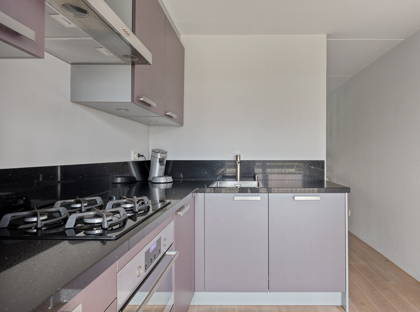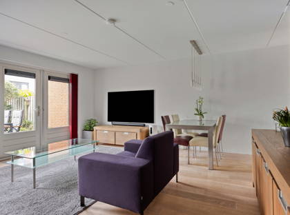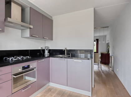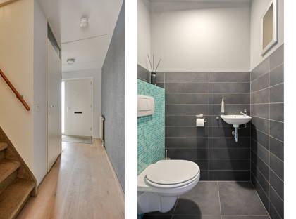 Binnenkomst vindt plaats in de hal met een modern, zwevend toilet. De woonkamer is afgewerkt met een fraaie lamelparketvloer en staat in directe verbinding met de tuin via openslaande tuindeuren, wat zorgt voor veel licht en een prettige, open sfeer. De L-vormige keuken is compleet uitgerust met vaatwasser, gaskookplaat, afzuigkap, combi-magnetron, koelkast, diepvries en composiet werkblad en biedt alle comfort voor dagelijks gebruik.