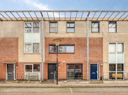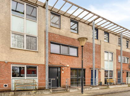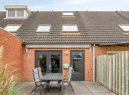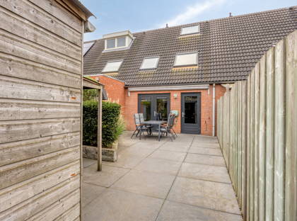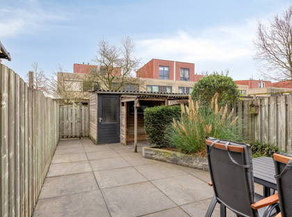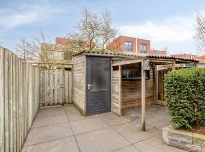 De onderhoudsarme achtertuin beschikt over een praktische achterom en een houten berging, ideaal voor fietsen en tuinspullen. Parkeren kan gemakkelijk direct voor de woning.