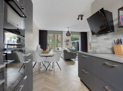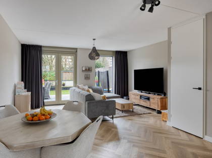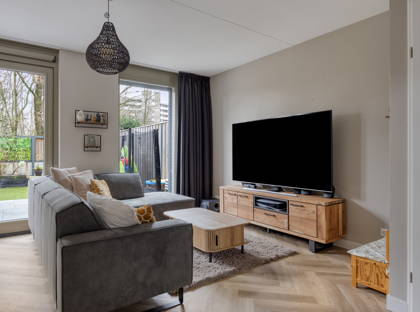 De woonkamer is ruim en uitnodigend en staat via openslaande tuindeuren in directe verbinding met de zonnige achtertuin. Dankzij de ligging aan het park ervaar je hier veel rust en privacy. Een heerlijke plek om te ontspannen, terwijl kinderen veilig buiten kunnen spelen.