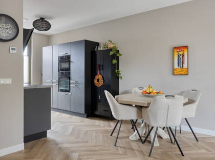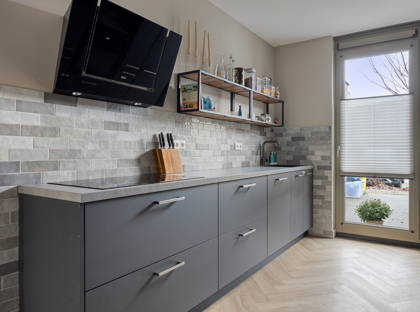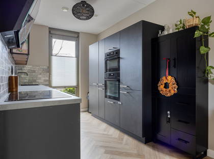 Aan de voorzijde van de woning bevindt zich de moderne open keuken, strak afgewerkt en voorzien van alle benodigde inbouwapparatuur. De keuken vormt het hart van de begane grond en biedt volop ruimte om samen te koken en te eten.