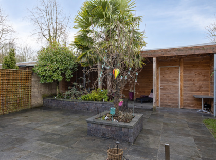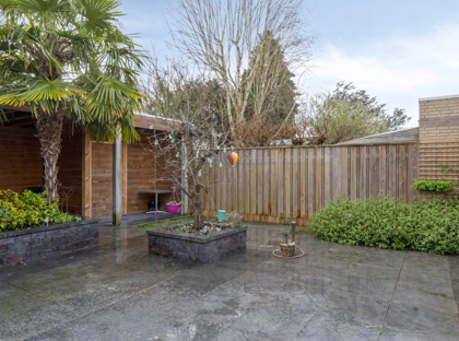 + De onderhoudsvriendelijke achtertuin is gunstig gelegen op het zuiden en biedt volop zon. De tuin is verzorgd aangelegd en beschikt over een terras met twee zonneluifels, een royale, sfeervolle overkapping en een houten berging.