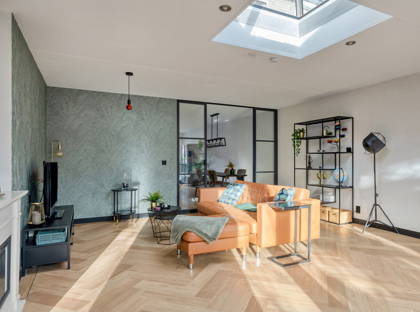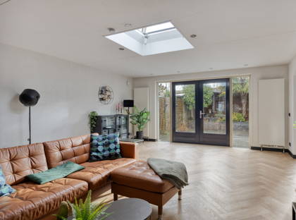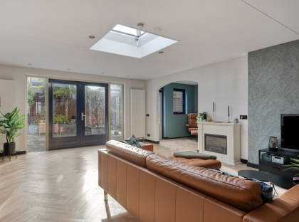 + De uitgebouwde woonkamer met lichtkoepel en gashaard is erg ruim en staat via stalen deuren in verbinding met de keuken aan de voorzijde van de woning. De openslaande tuindeuren zorgen voor een directe verbinding met de zonnige achtertuin. Deze royale leefruimte biedt voldoende plek voor zowel een ruime zithoek, eethoek als een werk- of speelhoek.