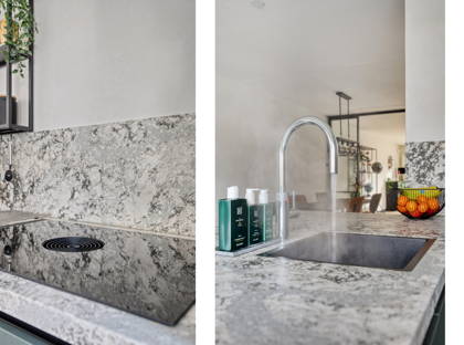+ De open keuken is uitgevoerd in een praktische U-opstelling (nieuw 2022) inclusief een bar om aan te zitten. Verder is deze uitgerust met luxe inbouwapparatuur, waaronder een Quooker kokendwaterkraan, inductiekookplaat met geïntegreerde afzuiging, vaatwasser en combi-oven.