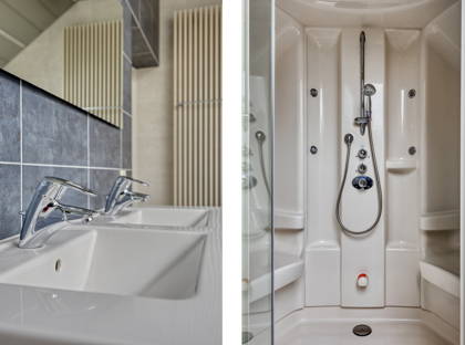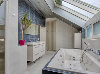 + Ook de luxe badkamer is uitgebouwd en voorzien van een ligbad, ruime douche met stoomcabine, wandtoilet, badkamermeubel met dubbele wastafel, designradiator, spotverlichting en rolluiken.
