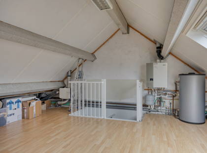 + De tweede verdieping is met een vaste trap bereikbaar. Hier is een vierde (slaap)kamer te realiseren met laminaatvloer en dakraam. Ook vind je hier de Nefit HR combiketel (2010) met een boiler van 200 liter.