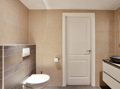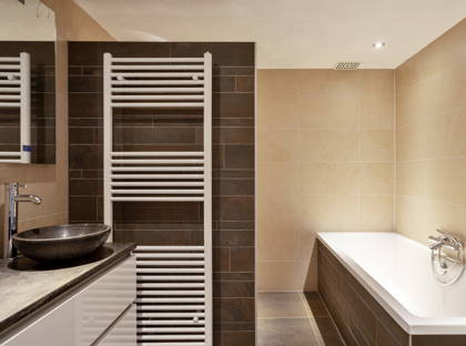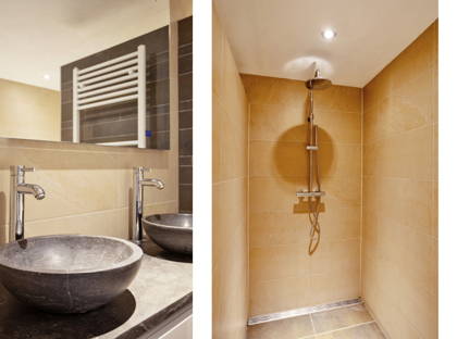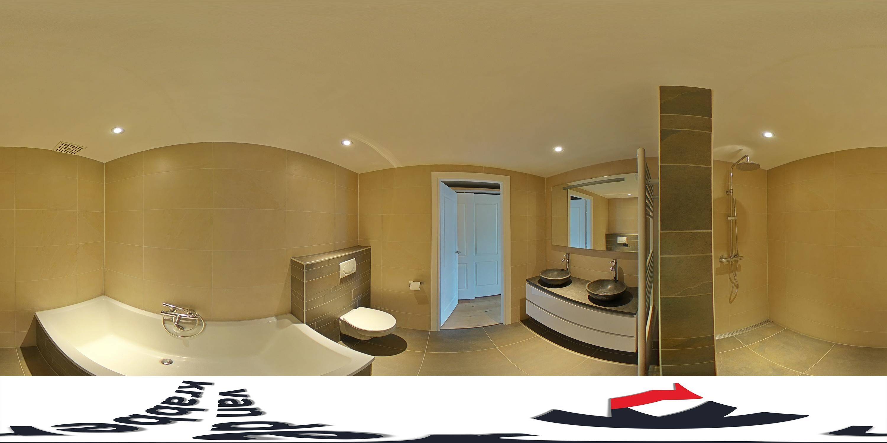 De badkamer is compleet ingericht met een inloopdouche, ligbad, toilet en dubbele wastafel. Daarnaast beschikt de ruimte over een designradiator, mechanische ventilatie en een stucplafond.