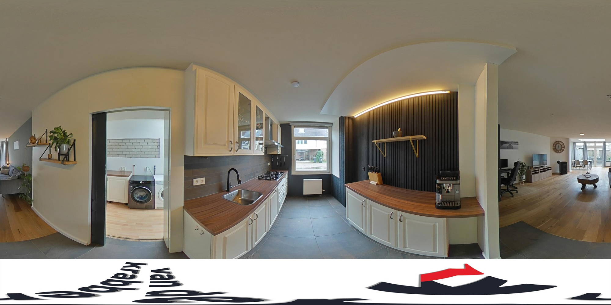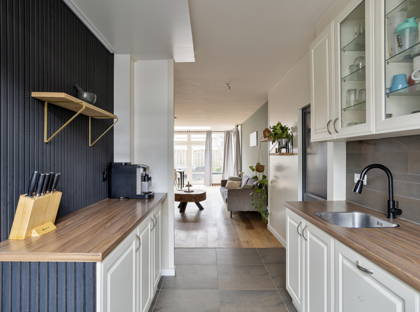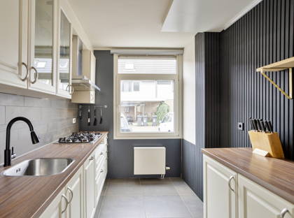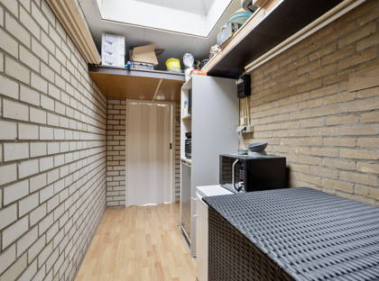 De keuken is uitgerust met een 5-pits gaskookplaat en afzuigkap. Vanuit de keuken is er toegang tot de bijkeuken, waar zich de aansluitingen voor het witgoed bevinden.