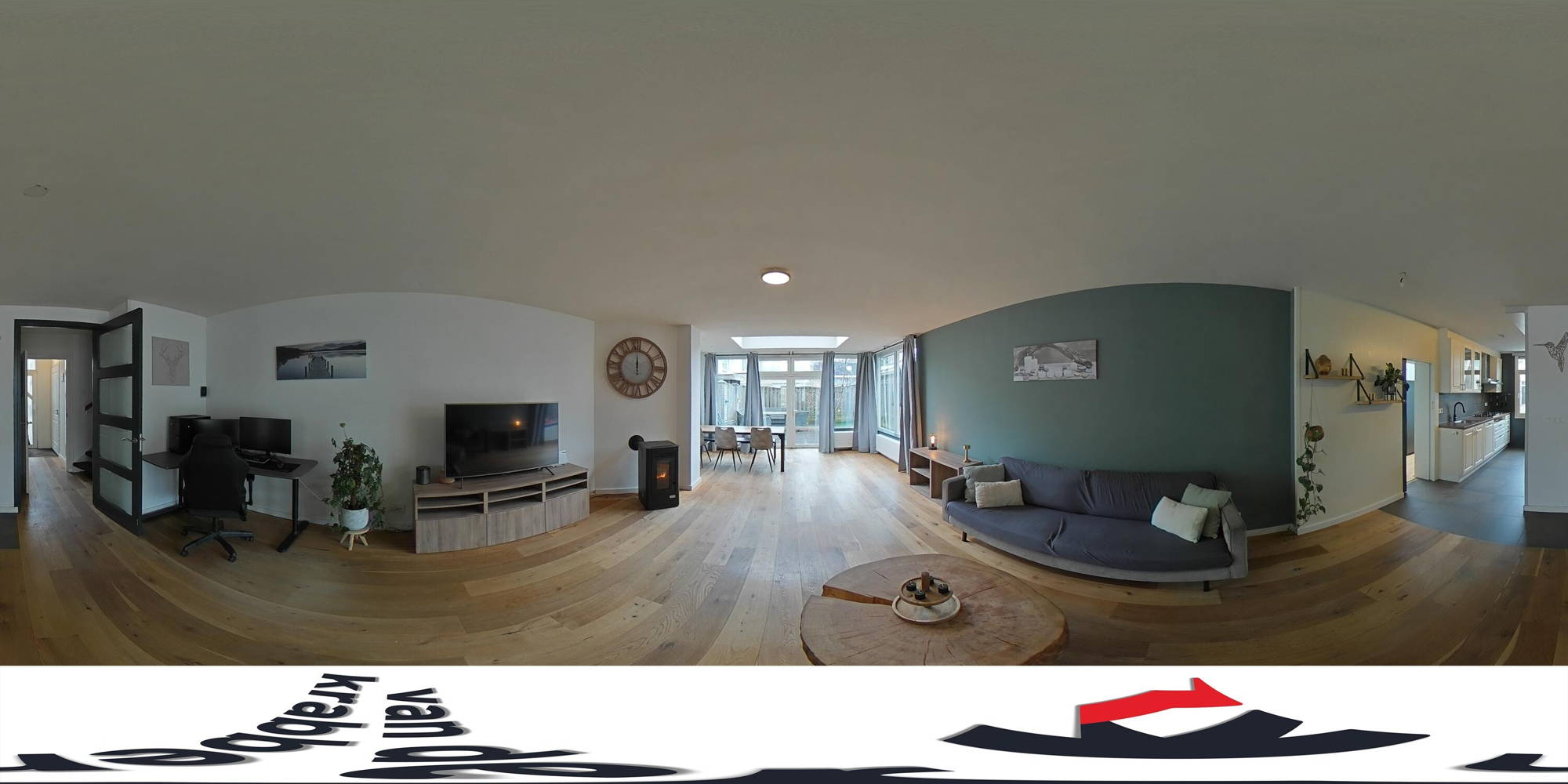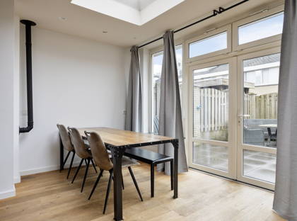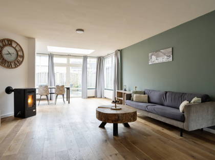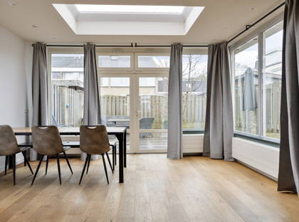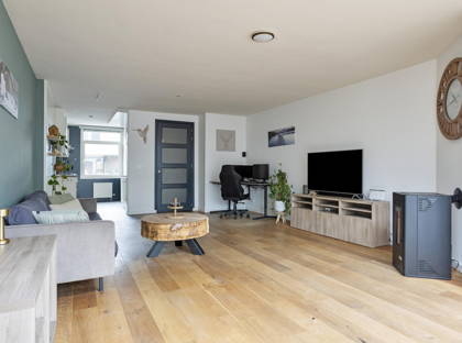 De woonkamer is ruim en licht dankzij de uitbouw aan de achterzijde. De ruimte is afgewerkt met een houten vloer en stucwerk wanden en plafond. De uitbouw is voorzien van een lichtkoepel en openslaande tuindeuren, waardoor er veel daglicht binnenkomt en er een directe verbinding met de tuin ontstaat.